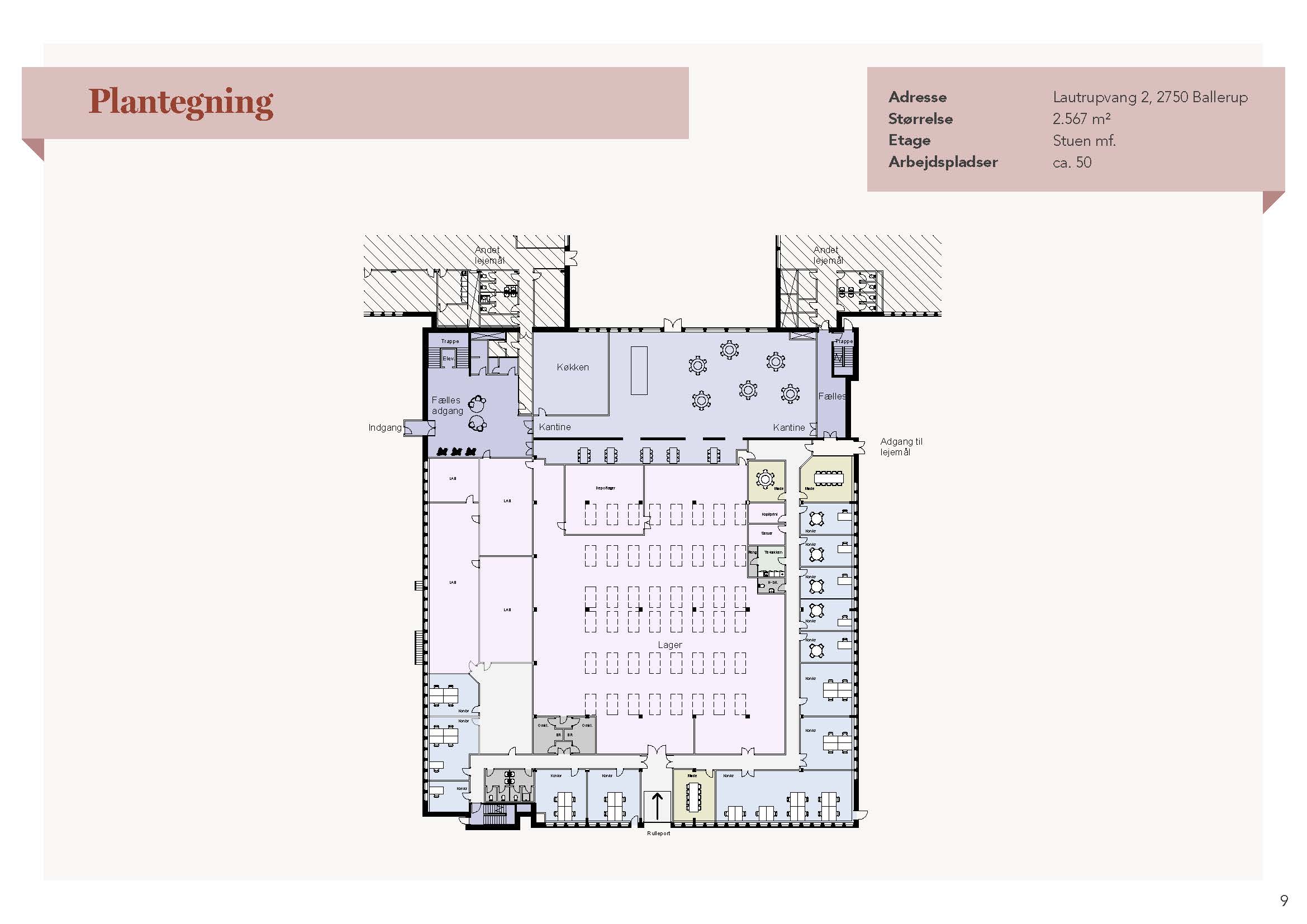 Lejere får adgang til en moderne kantine med frokostordning, et auditorium til møder og præsentationer samt et fitnessområde med omklædning og bad. Der er fri parkering på en stor parkeringsplads med etablerede ladestandere til elbiler, og cykelparkering ligger ved hovedindgangen. De fælles arealer fremstår lyse og nyrenoverede, og der er mulighed for mindre lagerplads i kælderen.