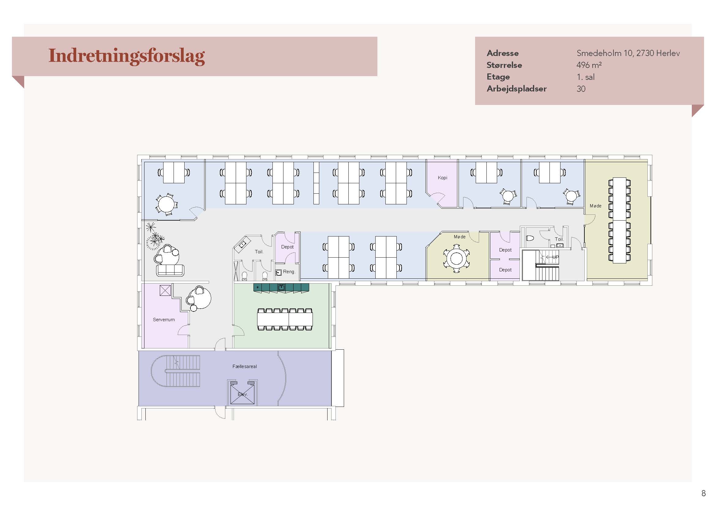Smedeholm 10 rummer fleksible erhvervslejemål til kontorbrug med adgang til fælles faciliteter, der understøtter en moderne arbejdshverdag. Ejendommen har gode adgangsforhold og er indrettet til effektiv drift, hvor lejerne kan tilpasse indretning efter behov. Der er mulighed for både kontor og administrative funktioner — i omgivelser der sikrer funktionalitet og ro.