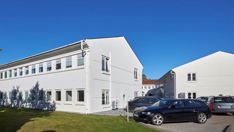 Kontor med kantine og parkeringspladser ved døren